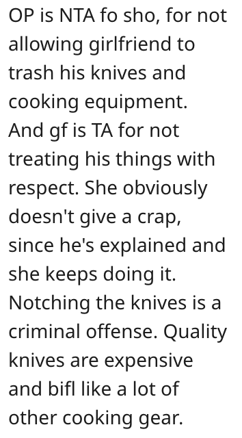 And this individual said he’s NTA and said she doesn’t touch her husband’s cooking gear.