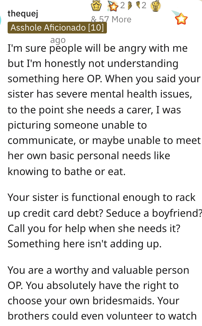 This OP has spent a large part of her life caring for a older sister with mental health issues that can be severe at time. Her father’s illness and the large age gap between them and other siblings meat that the bulk of the responsibility fell to her.