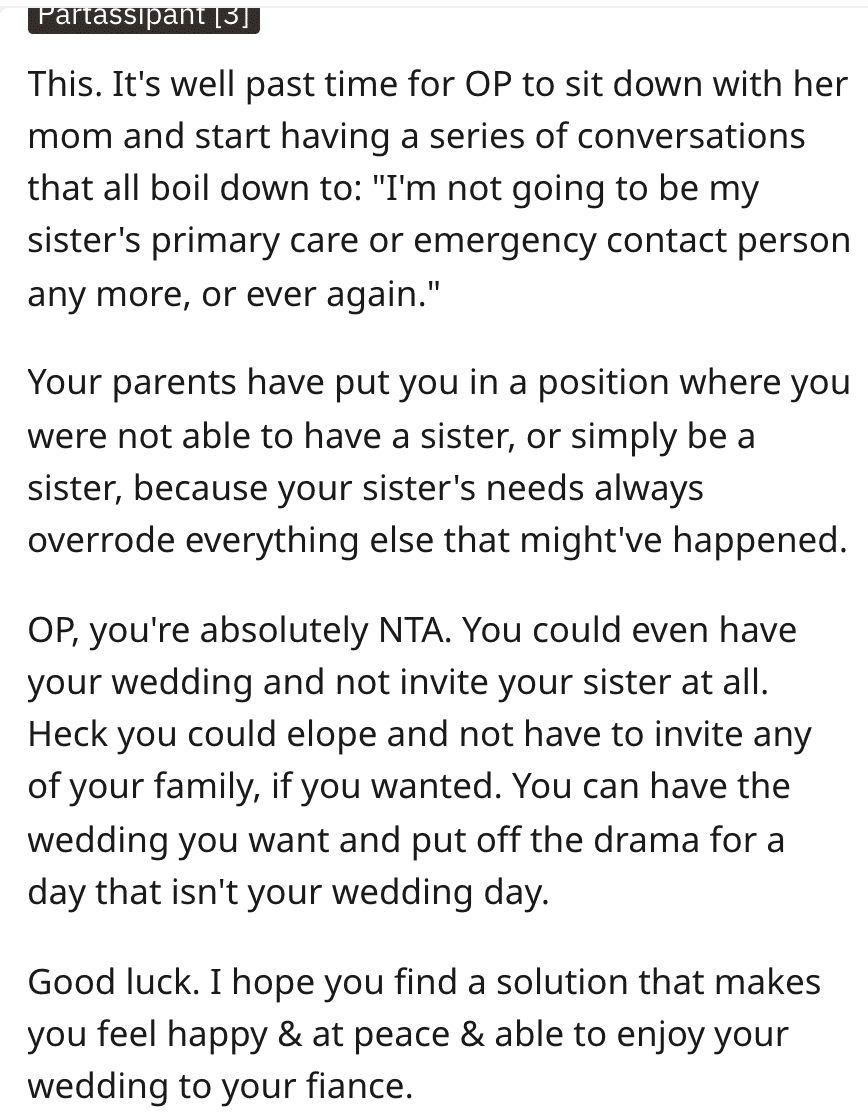 This person thinks OP would be well within their rights to not invite their sister to the wedding at all.