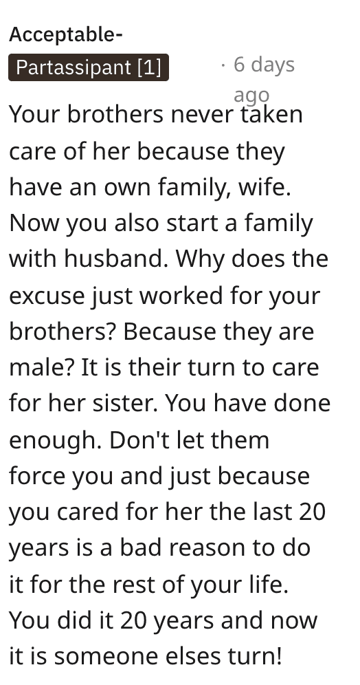My mom and brothers are shocked, and say it’s extremely damaging for my sister to be rejected like this. One of my brothers says I’m being ableist. My mom says she always thought that one day when she’s too old to take care of my sister and I’ve worked for a few years that I would look after her full time (this was news to me), but now she’s not so sure.