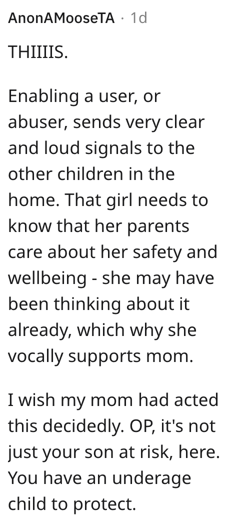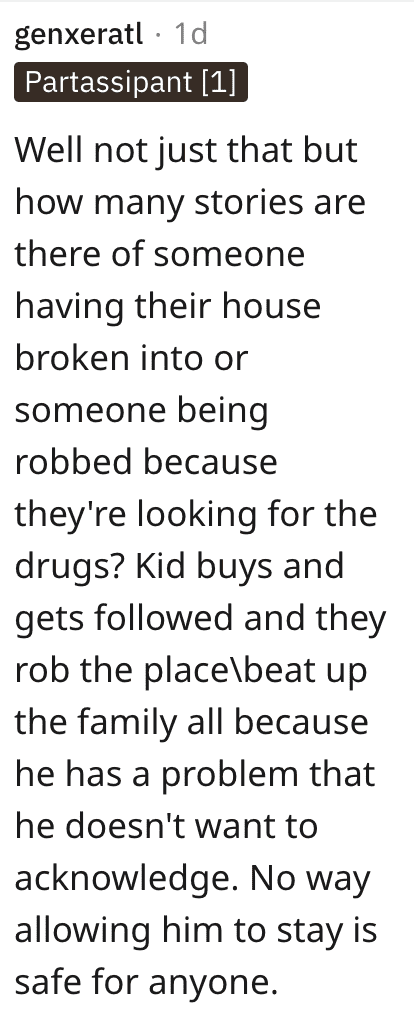 Several people pointed out that they have another child to consider, and that having the son there could put all of their safety in jeopardy.