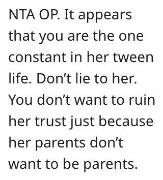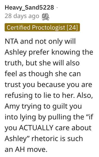 And this reader said she’s NTA and that she did the right thing by not lying to her.