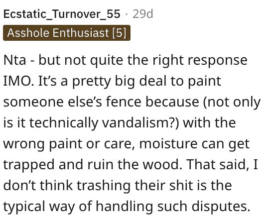 He laughed at me and essentially told me to get f**ked. Well I went back there, tossed all his c**p off off my fence, pulled all of his plants out and tossed them in his yard and painted the side towards his fence an obnoxious bright yellow.