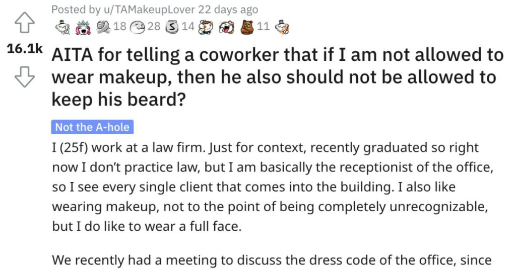 And a woman took to Reddit’s “Am I The A**hole?” page to ask if she was a jerk for how she reacted when a coworker told her she shouldn’t be allowed to wear makeup.