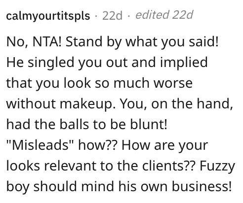 Of course, I was shocked when he said that, and I could see that a lot of my coworkers were too, since the comment was so unwarranted. I told him “Well, If I am not allowed to wear makeup, then you shouldn’t be allowed to keep your beard, given that you go from a grown man to a 12-year-old when you shave”. He turned really red, and tried to say something, but my boss did not let him.