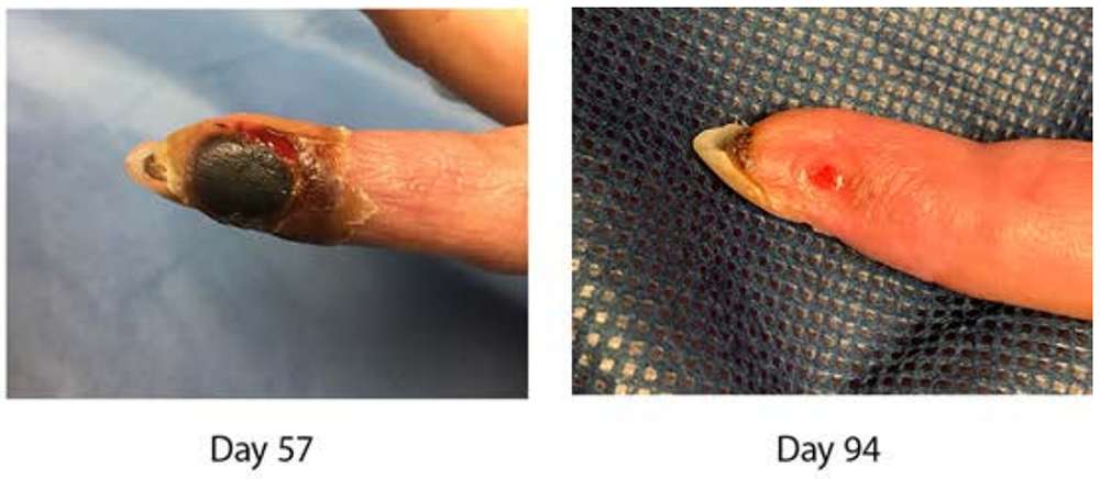 The infection cleared up on Day 94, though the worker was relieved of lab duties for 4 months due to her necrosis and a continued potential for transmission.