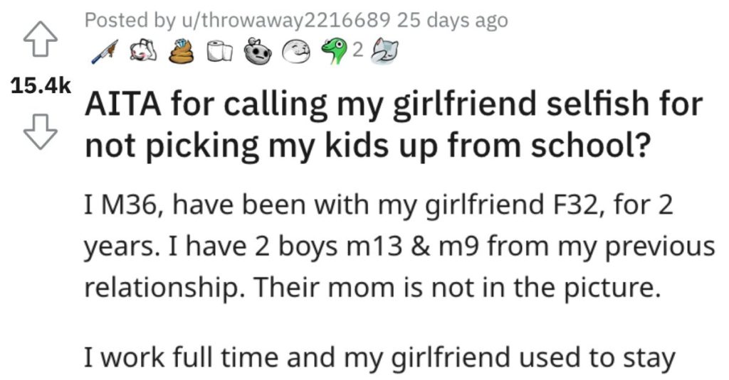 AITA for calling my girlfriend selfish for not picking my kids up from school?