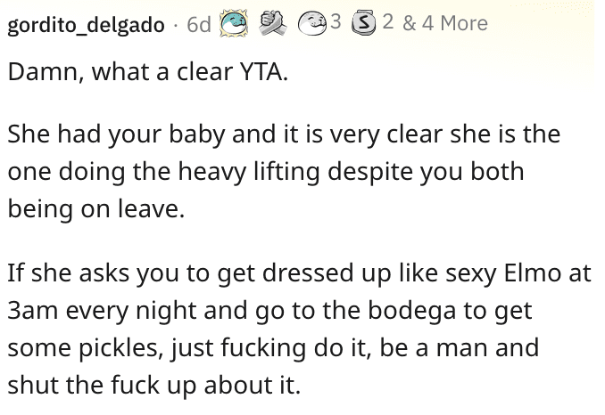 Another reader argued that this man should be doing whatever his wife asks because that’s what you’re supposed to do in this situation.