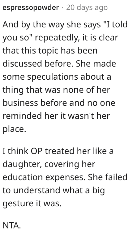 And this individual said it sounds like ths didn’t appreciate how big this gesture was from her uncle.