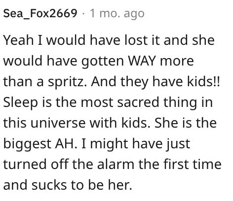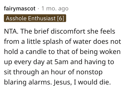 Yesterday, I decided I had enough of this bullsh**t and when her first alarm went off, I took my water bottle and sprayed water on her face. She was awake instantly, turned off her torture device(phone) and I could go back to sleep. She didn’t say anything so I did it again this morning.