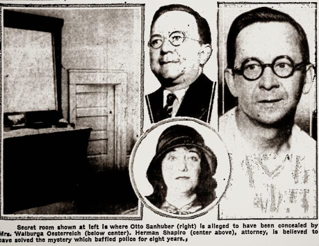What happened next varies somewhat in the telling. One way or another the guns went off and Fred Oesterreich died. Sanhuber locked Dolly in a closet and scurried back to his hiding place in the attic. When the police arrived shortly thereafter, alerted by a neighbor who had heard the shots, Dolly was able to claim that a burglar had broken into the house, killed her husband, and locked her up. Police were suspicious, but couldn’t explain how Dolly would have been able to lock herself up.