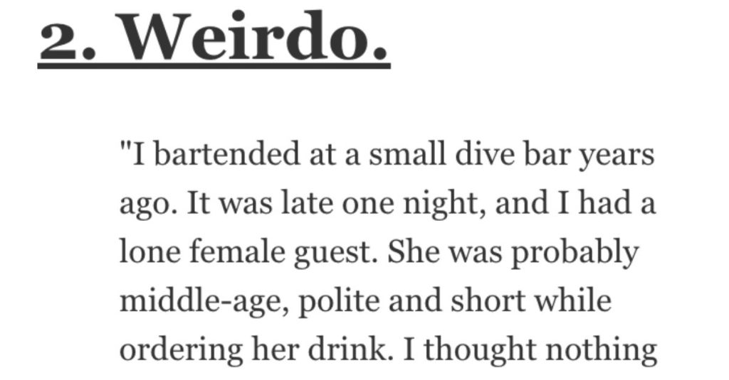 It was late one night, and I had a lone female guest. She was probably middle-age, polite and short while ordering her drink.