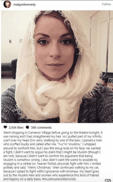 A young woman named Maigan Kennedy says she was harassed with anti-Muslim hate speech in Cameron Village, North Carolina for wearing a scarf on her head—and she isn’t even Muslim, she just wore a scarf because it was raining (though that gauzy scarf couldn’t have provided much protection). Kennedy decided not to tell the person who harassed her that she wasn’t Muslim, however. “I didn’t want to confirm his argument that being Muslim is somehow wrong,” Kennedy wrote. “I also didn’t want the scene to escalate by engaging in a verbal (or, heaven forbid, physical) fight with him.” Instead, she went with a perfect, two-word response.
