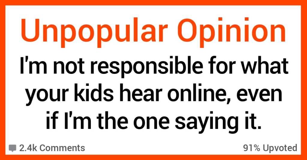 But I do also agree adults should not have to worry about censoring themselves in online interactions. As long as they aren’t harassing or engaging in illegal content, adults should not be compelled to cater to children.