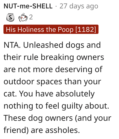 I told my friend about it and I was surprised that she agreed with my neighbors. She said dogs always take priority over cats in outdoor spaces because it’s a need for dogs and an extracurricular for cats so I should just sit with him on my porch if I want to take him outside.