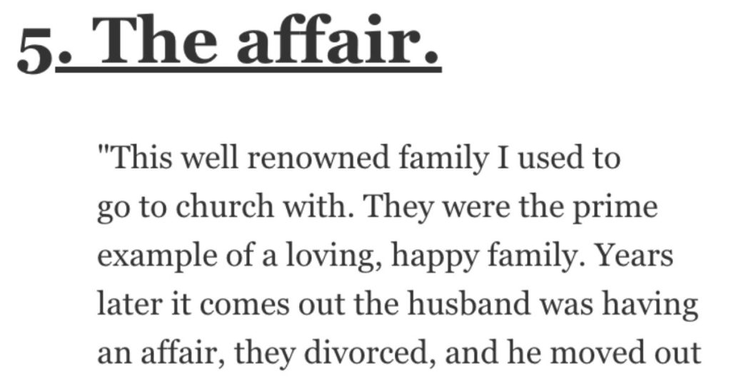 They were the prime example of a loving, happy family. Years later it comes out the husband was having an affair, they divorced, and he moved out of town, the church didn’t accept him anymore, neither did the community.