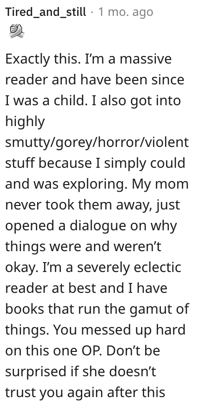 I told my husband about the books and he told his parents. My mother-in-law ended up asking me to point out which ones I knew were too mature for her and she confiscated them.