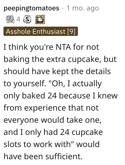 So Reddit, am I the a**hole for baking 24 cupcakes instead of more? I mean I could do just one more round in the oven with ONE or two more cupcakes but it would be a waste of electricity and my time.”