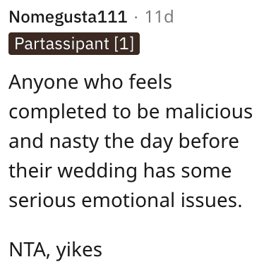 And finally, this reader said that this wasn’t an attempt at humor and that the bride was trying to push her buttons.