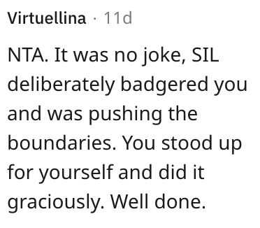 Another person said that she needs to call out her brother-in-law if he ever brings it up again.