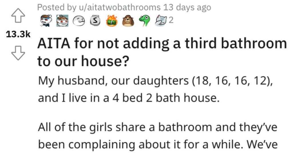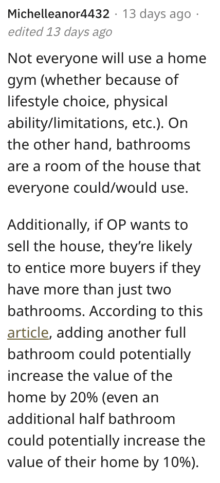 Another reader said adding another bathroom to the house will be the better decision in the long run.