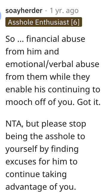 This person said this woman is NTA but that she needs to stop making excuses for this guy.