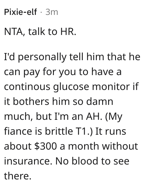 That was last Thursday before the holidays, tomorrow I’m thinking of going to talk to HR before James does, but first I need to know that I’m in the right here. So AITA for not being more accommodating of James’ blood/needle phobia and checking my blood sugar as needed at my desk.