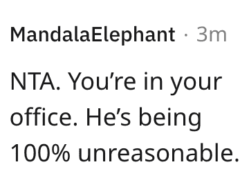 He also clarified that he has an actual office, with a door, so his coworker has to actually come into his space to see what’s going on.