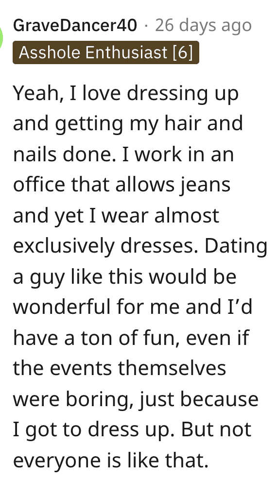 He got pissed and said that most girls know how to dress themselves and do their own makeup nice, and I got so frustrated I said sarcastically “go date most girls then, I’m sure ‘most girls’ would looove being treated like a human dressup doll!”