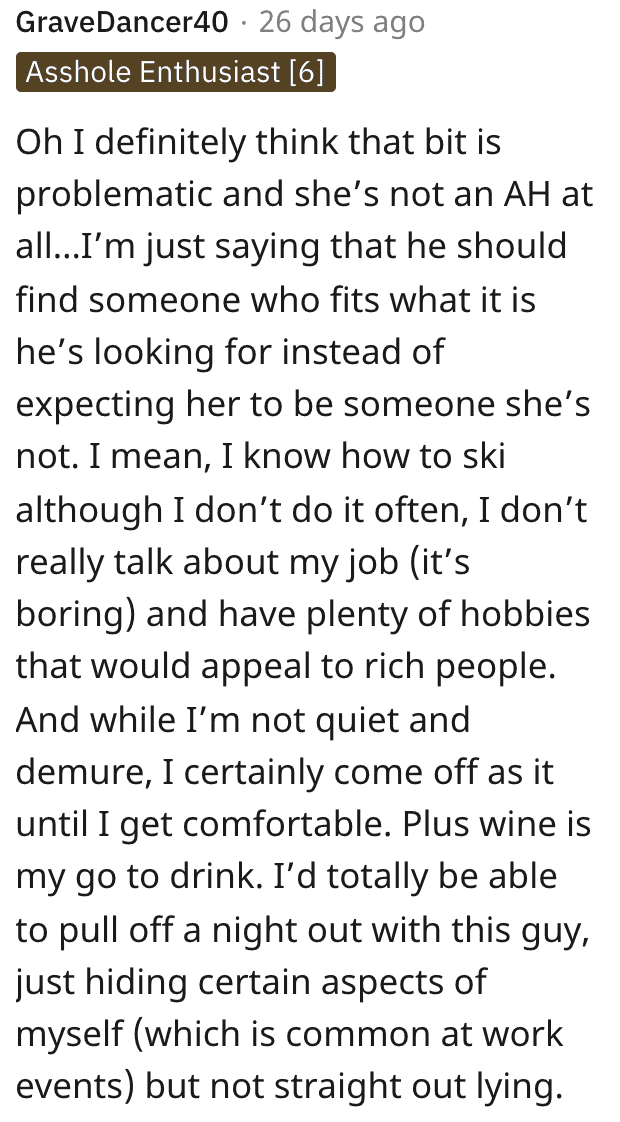 - I’m always happy to attend social events and be polite, friendly, and talk to people and get to know them. For free. But this wasn’t what he was asking of me, he wanted me to act. To not speak of my actual hobbies or career and to give the impression that I am a stay at home partner. To claim to ski… I have no idea how to ski! To only order “classy” drinks and none of the drinks I actually drink. That doesn’t strike me as going to an event as a partner, that strikes me as going to an event as an actress or performer. Which is a whole job!