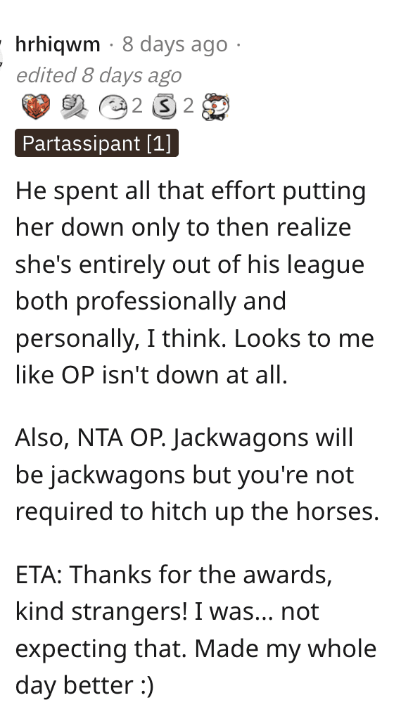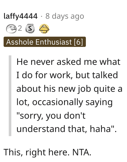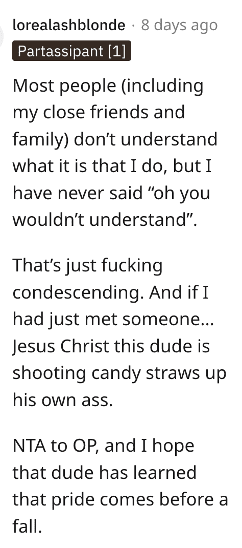 OP offered to pay for drinks but he wasn’t having any of it, and she never told him that she did, in fact, understand his jargon because she was in the business, too.