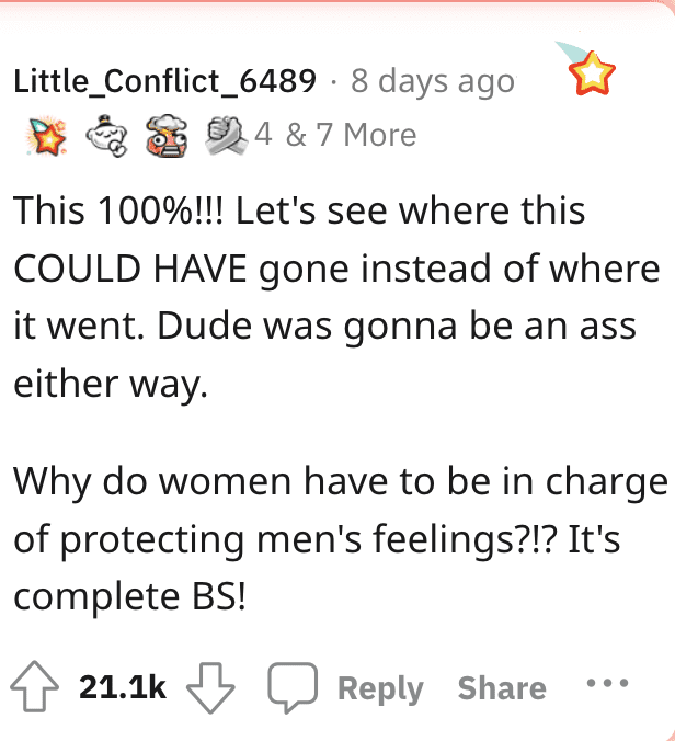 But now Grace and her boyfriend are on his side too, saying that it would’ve cost me nothing to tell him early in the evening and I only kept it for myself for my own entertainment.