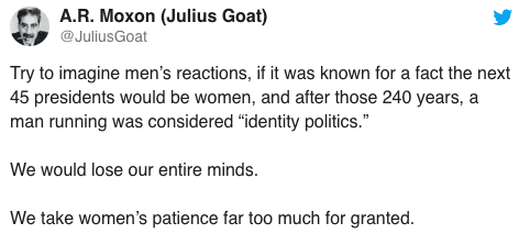 45 male presidents in a row…wrap your head around that. And think of how it must feel to be on the other side and be accused of “identity politics” for simply wanting to have your voice heard.