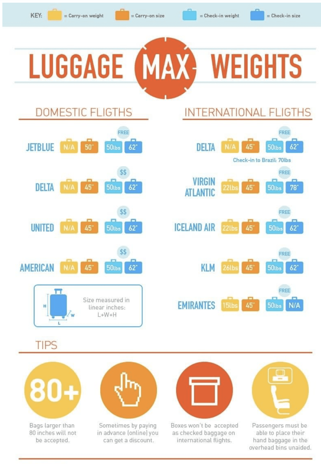 Vacation can cost a pretty penny – most of us save for a year or more! So don’t get caught paying extra for your luggage. Take a look at this chart to gauge airline maximum weights (and avoid paying extra fees).