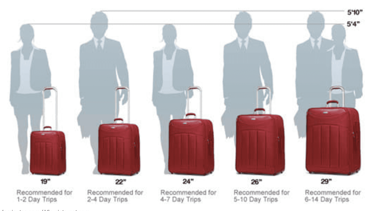 Unless you are the type to pack ten different outfits for one day because you can’t decide, here are some recommended luggage sizes based on the length of your trip. You could also consider forgoing the bulky suitcase for a nice squishy duffel, especially for quick or overnight stays.