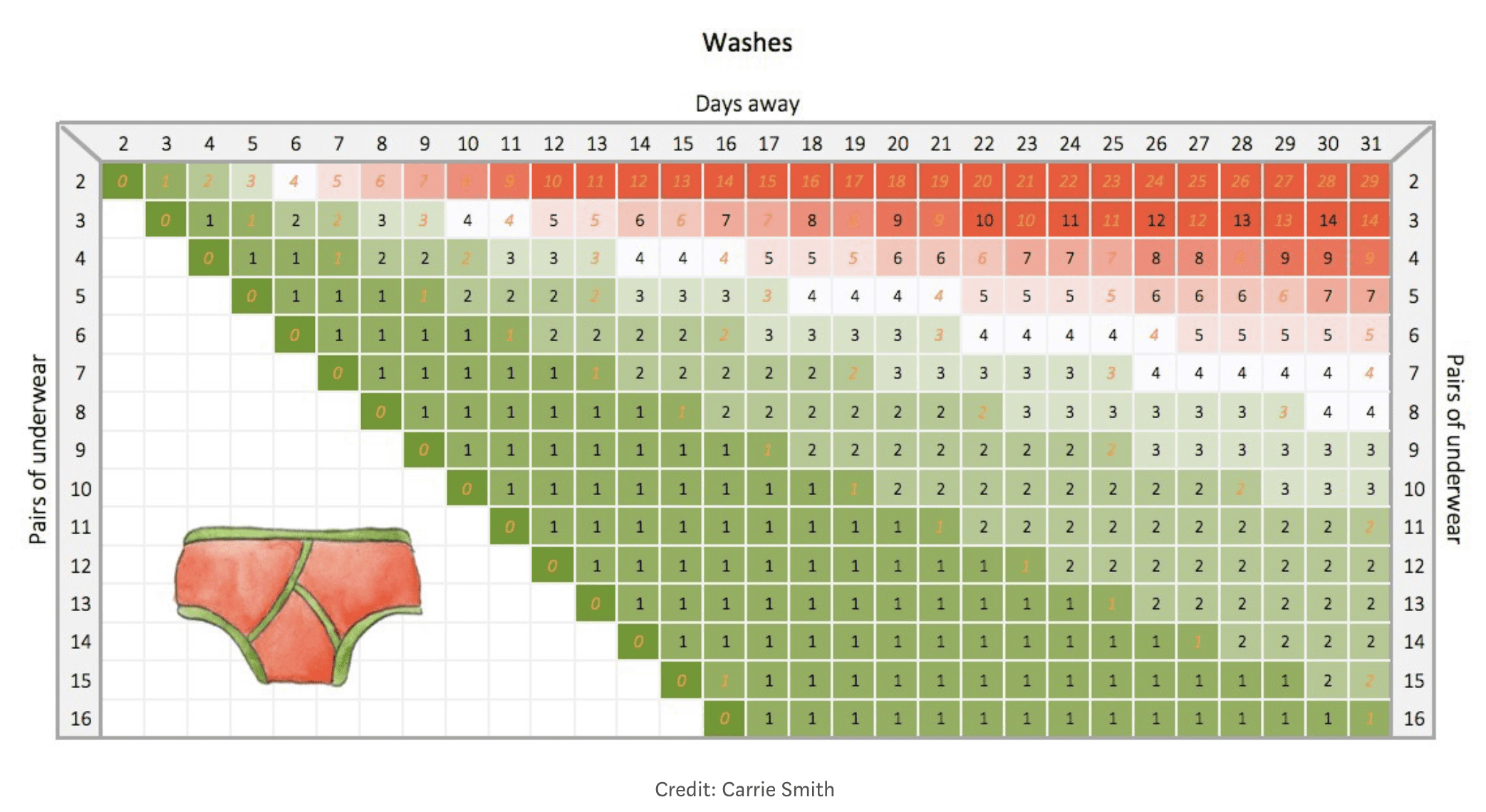 No one wants to wear dirty underwear while on a trip, right? But how much do you pack? This chart measures out exactly how many to take including if you plan to do laundry while away.