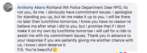 Akers did eventually turn himself in, even posting a selfie marking the occasion to the Facebook comment section. All is right with the Richland, WA world again.