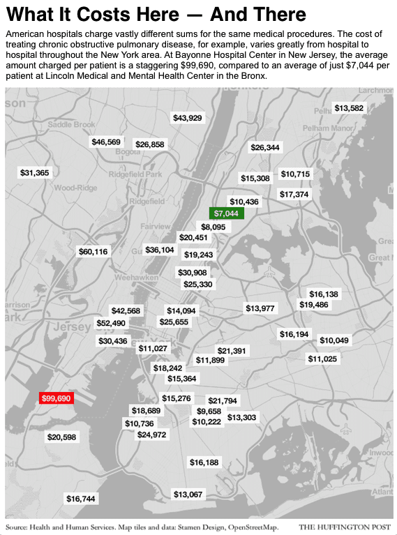 And each hospital has their own individual Chargemaster, so what might cost $7,000 at one hospital might cost $100,000 at another facility. One glaring example: if a patient goes to the Bayonne Hospital Center in New Jersey to receive treatment for the respiratory disease COPD, they can expect to be slapped with a bill for $99,690. Less than 30 miles away at the Lincoln Medical and Mental Health Center in the Bronx, the same treatment costs $7,044. And it seems like there is no rhyme or reason for the differences in costs. It all boils down to an incoherent system. Here is a graphic that illustrates the radical price differences for the same procedure in the same area.