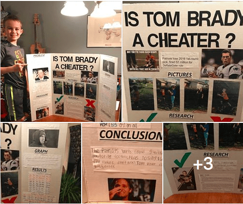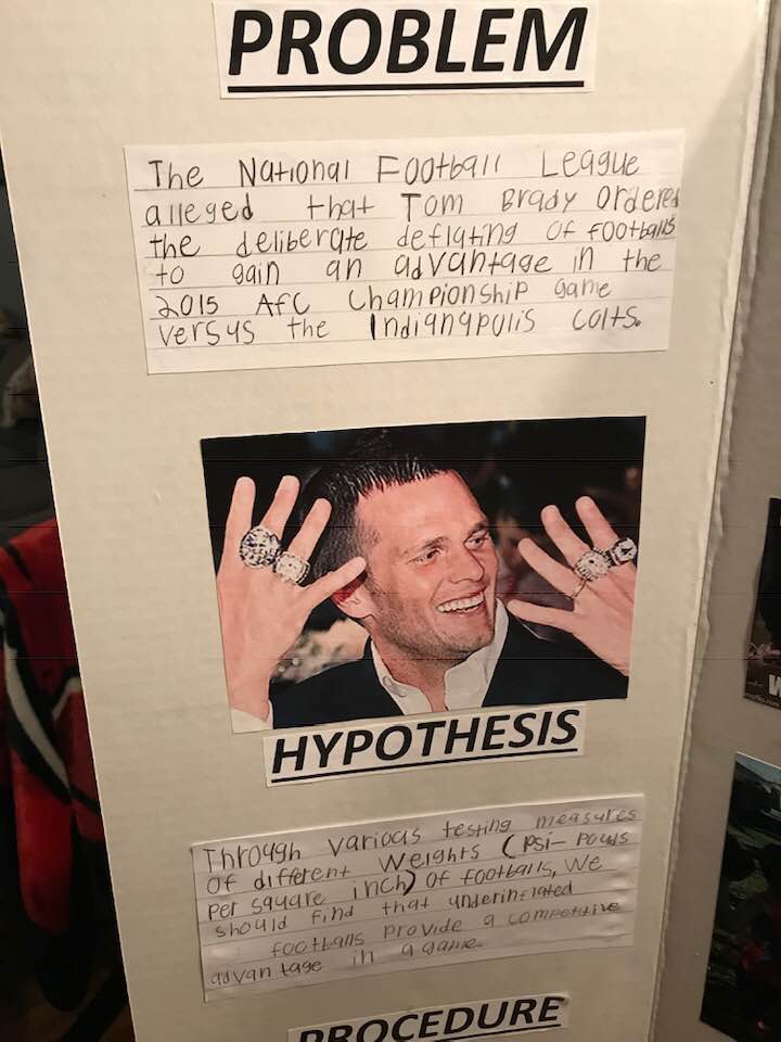 The accompanying poster – which won David an Honorable Mention and a trip to the district science fair – included a deflate-gate meme, a picture of Tom Brady crying, and a picture of the quarterback making a weird face.