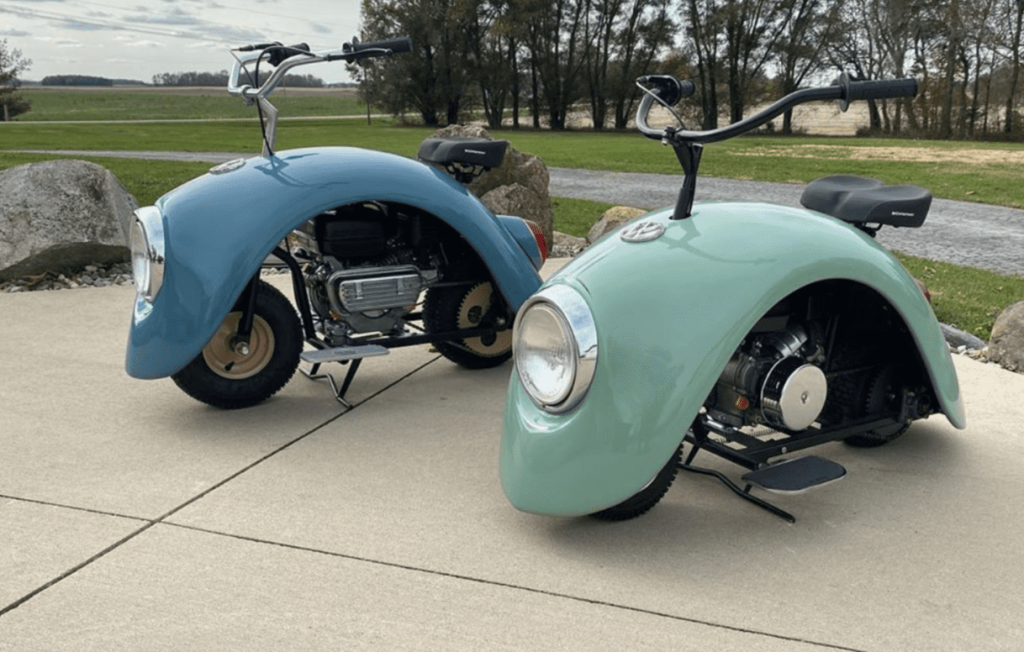 Walter uses the fenders from classic Volkswagen Beetles to build his custom Volkspod minibikes, and they look sick. He said, “I wanted a scooter to take to VW shows. These fenders were left over from building my car. I also wanted to practice welding the thin sheet metal panels.”