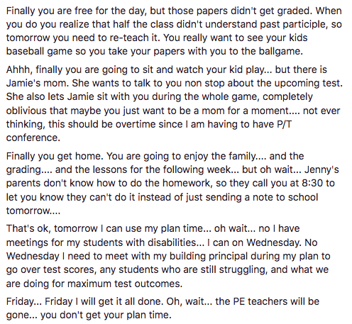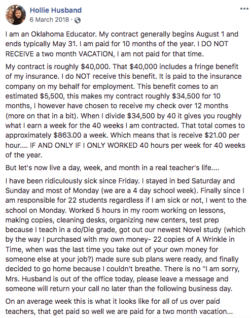 Another Oklahoma educator, Beth Wallis, penned a viral post describing a day in the life of a teacher – one that begins with her bank account being overdrawn because of a gas company error (that’s how close teachers can be to not having enough cash to cover expenses) before launching into a heartbreaking picture of finding out that another one her students had passed away.