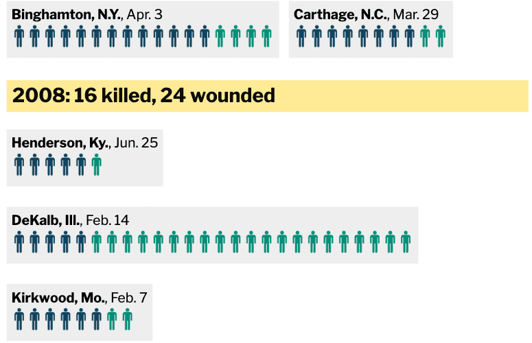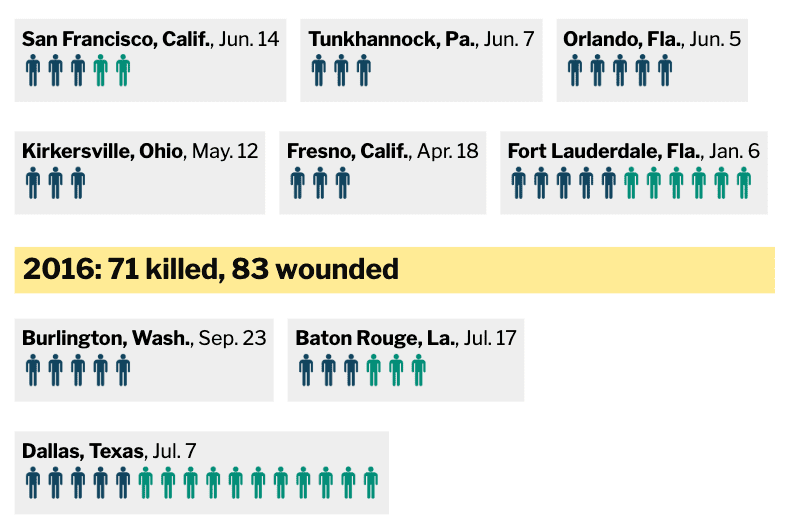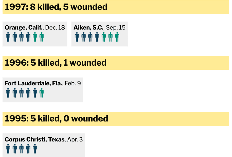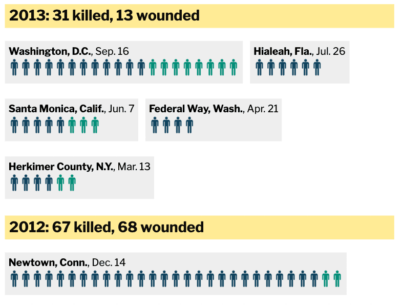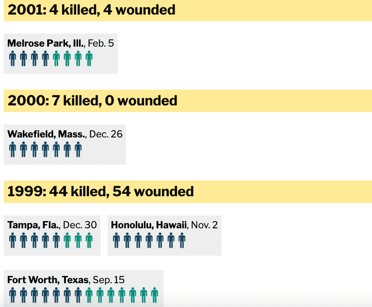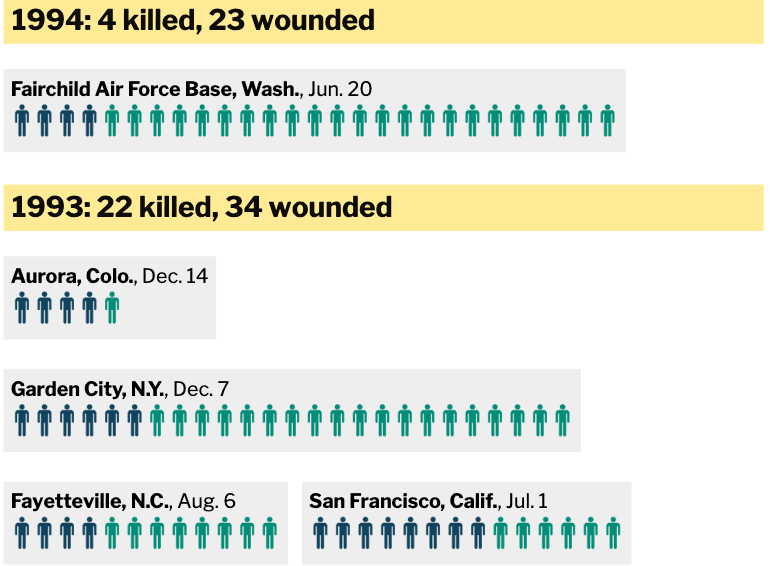 A chart compiled by Mother Jones, shows how serious America’s mass shooting epidemic has become and how it has evolved since 1982. The chart specifically looks at incidents of gun violence in which a shooter attacked indiscriminately in a public place, killing 4 or more people. It does not include conventionally motivated crimes (ie, robbery or gang violence), even if over 4 people ended up being murdered.