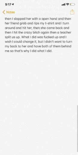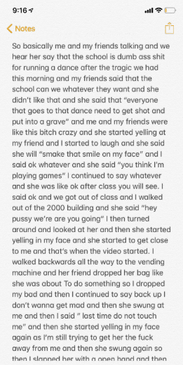 “So basically me and my friends talking and we hear her say that the school is dumb ass s**t for running a dance after the tragic we had this morning and my friends said that the school can we whatever they want and she didn’t like that and she said that “everyone that goes to that dance need to get shot and put into a grave” and me and my friends were like this b**ch crazy and she started yelling at my friend and I started to laugh and she said she will “smake that smile on my face” and I said ok whatever and she said “you think I’m playing games” I continued to say whatever and she was like ok after class you will see. I said ok and we got out of class and I walked out of the 2000 building and she said “hey pussy we’re are you going” I then turned around and looked at her and then she started yelling in my face and she started to get close to me and that’s when the video started. I walked backwards all the way to the vending machine and her friend dropped her bag like she was about To do something so I dropped my bad and then I continued to say back up I don’t wanna get mad and then she swung at me and then I said ” last time do not touch me” and then she started yelling in my face again as I’m still trying to get her the f**k away from me and then she swung again so then I slapped her with a open hand and then her friend grab and rips my t-shirt and I turn around and hit her, then she come back and then I hit the crazy b**ch again then a teacher split as up. What I did was f**ked up and I wish I could change it, but I didn’t want to turn my back to her and have both of them behind me so that’s why I did what I did. ”