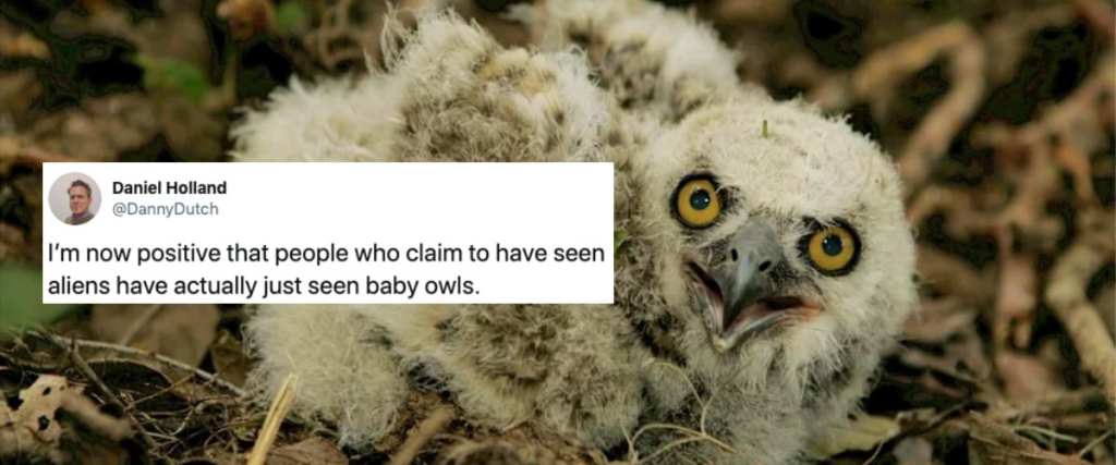 Okay, so now, this twitter user found some baby owls in his attic, made a video, and (probably rightfully) claimed to have figured out what’s up with all of those unverified alien sightings around the world.