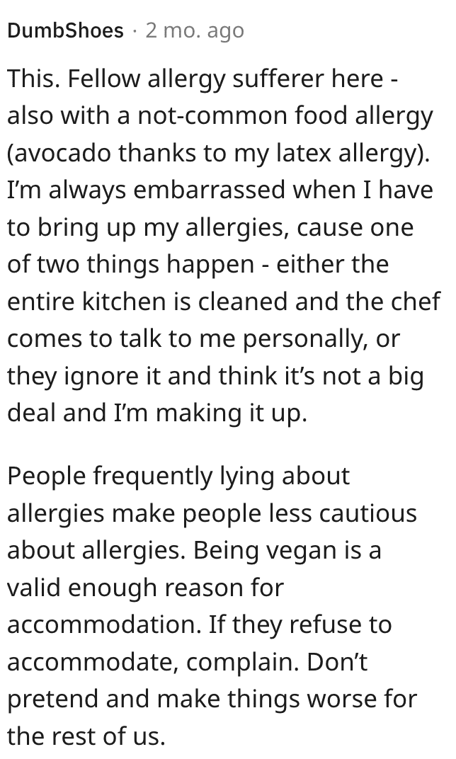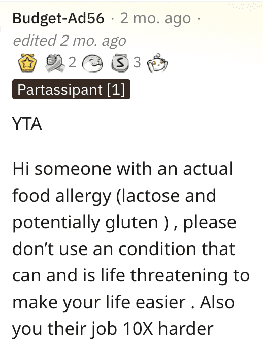 The top comment was not the only one to accuse OP of making life harder for those who have actual food allergies.