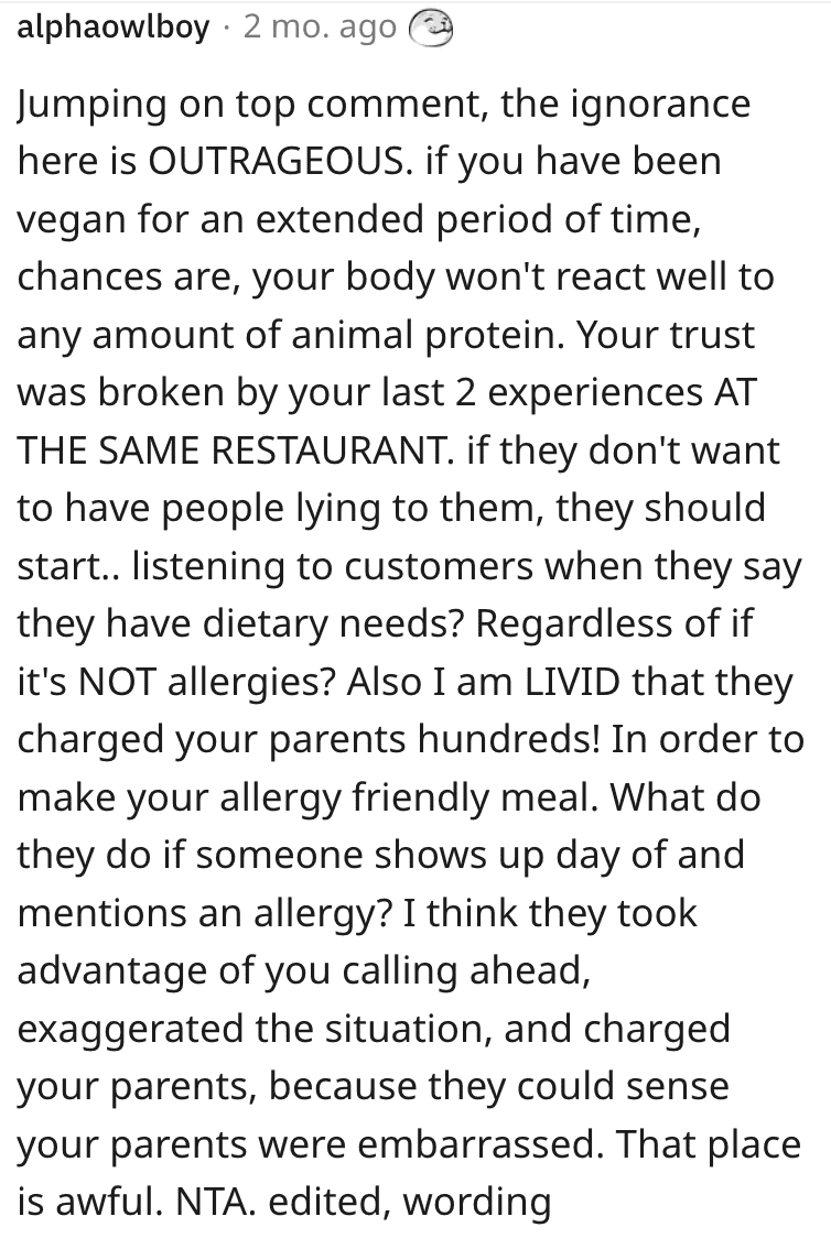 So, she told them she had a handful of allergies. The information apparently sent their kitchen into a tizzy (even though they just served her plain pasta) and cost her parents a bit of cash.