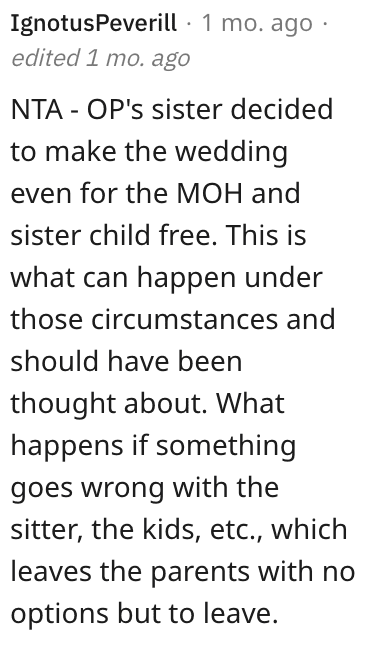 Another Reddit user said she’s NTA and that this is what can happen if you make a wedding child-free.