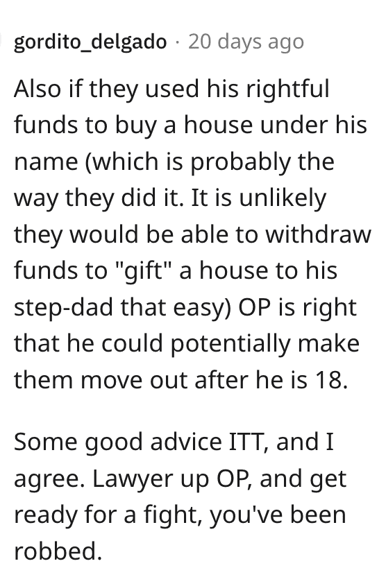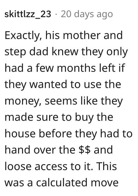 They tried to justify that it was for me too and I asked them does that mean they’re moving out when I’m 18 an the house is gone be in my name? And they’re like no. That’s what I thought. Supposedly the house was for my but max time I would’ve lived there was a few months.