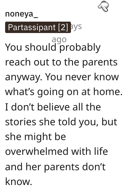 She insisted that wasn’t necessary and she can’t get her parents involved. I told her that’s her only option. Either she get the work on time done or we sit down with her parents. She left the room while yelling that people like me are the reason her generation has so many mental health problems because “we don’t understand their struggle”.