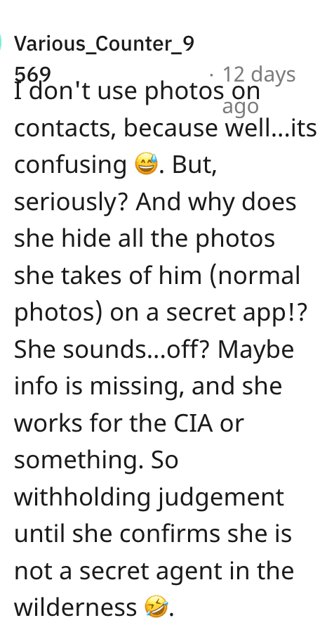 OP apparently didn’t assume that, because when she grabbed her husband’s phone one day (with his permission) and saw that he had a photo of her assigned to her contact…and she flipped out.